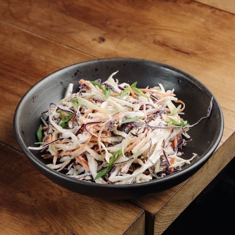 Капуста белокочанная и краснокочанная, морковь, соус майонезно-горчичный, лук зеленый.