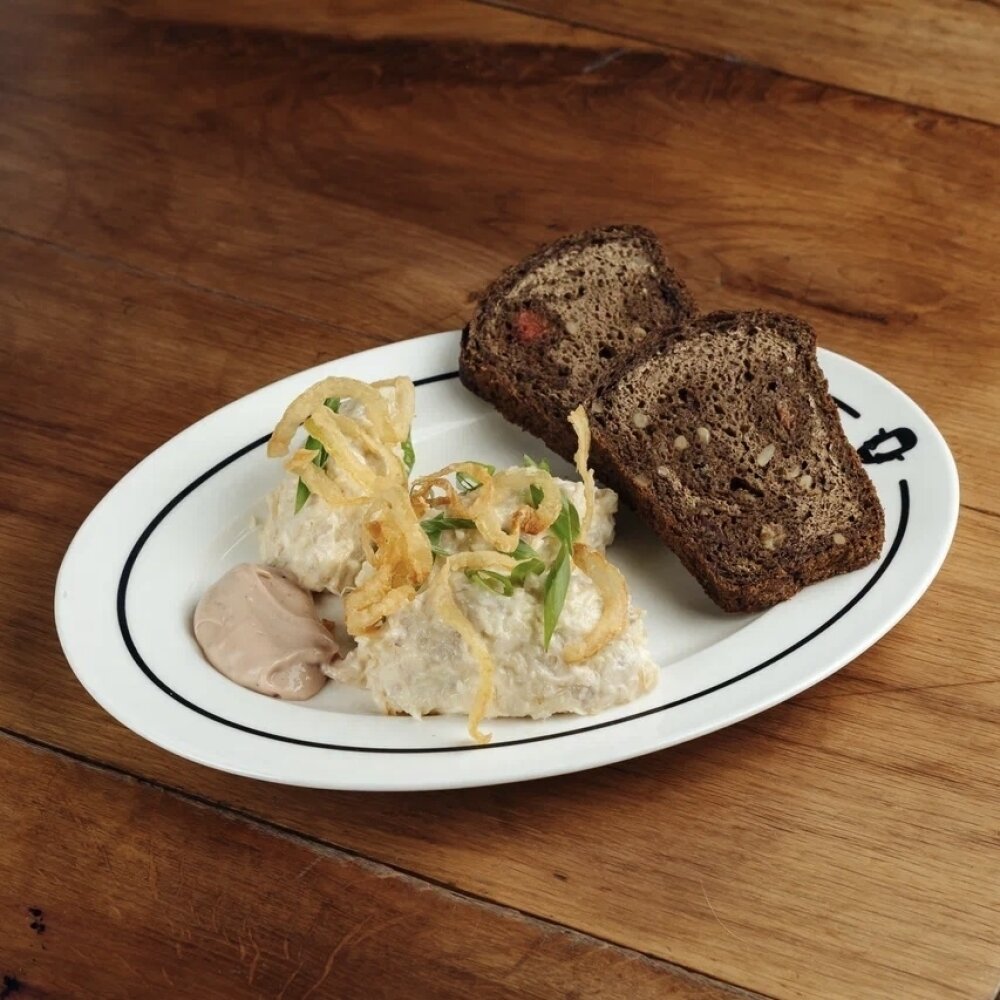 Сельдь филе в масле, картофель отварной, яйцо куриное отварное (белок), лук репчатый жаренный, мисо-майонез, яблоки свежие, лук зеленый, соус из печени трески с растительным маслом, лук, обжаренный во фритюре, хлеб