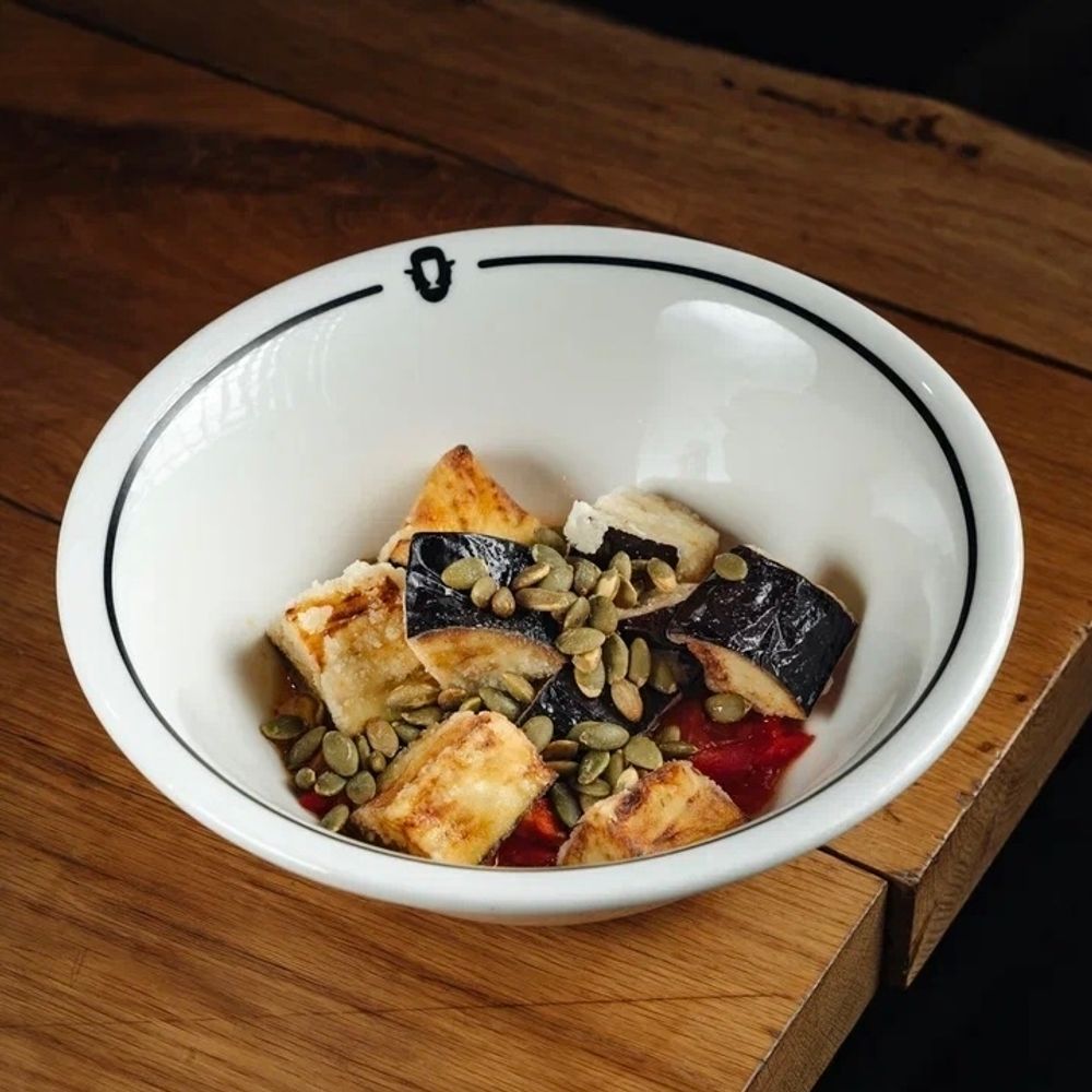 Болгарский запеченный перец без кожи, баклажаны жареные во фритюре (фритюрное масло, кукурузный крахмал), соус Сладкий Чили, соль, томаты конкассе, тыквенные семечки