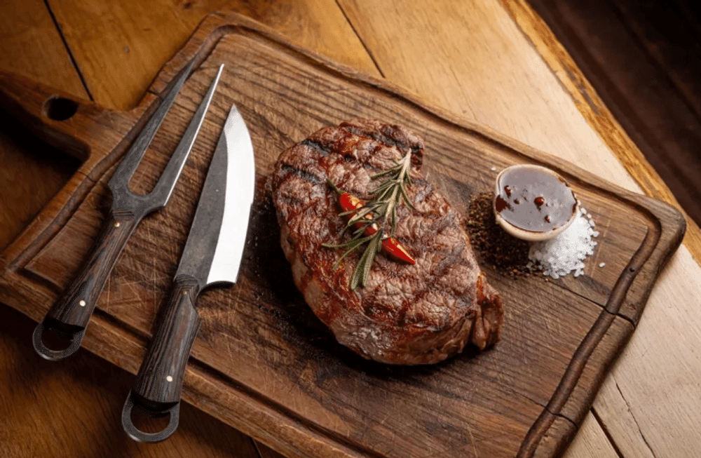 Стейк говяжий рибай обжаренный на гриле; соус нью-йорк (свит-чили, крем-бальзамик, устричный соус, томаты, хрен, чили, чеснок)