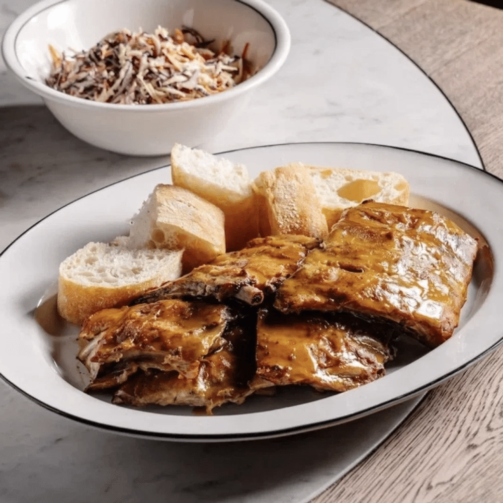 Ребра свиные, маринованные с медом и горчицей, копченые на ольховой щепе, салат Коул-Слоу (капуста белокочанная и краснокочанная, морковь, майонезно-горчичная заправка), хлеб Чиабатта