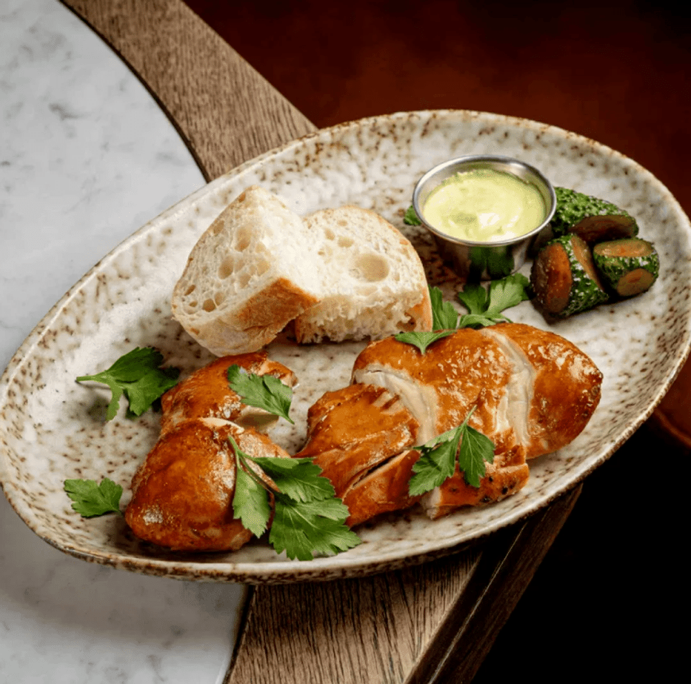 Цыплёнок (маринованный в соевом соусе с добавлением чеснока, горчицы и мёда) и копчёный на ольховой щепе, соус из хрена (майонез, хрен сливочный, масло зеленое), огурцы битые (огурцы, тайский рыбный соус, соус кимчи, мирин, лук зеленый и репчатый, кинза, сахар, чеснок, масло растительное), чиабатта