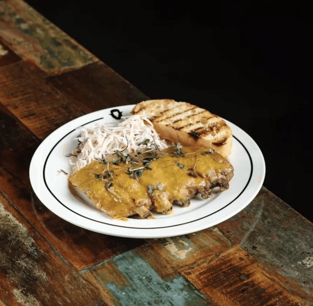 Ребра свиные, приготовленные в коптильне на ольховой щепе, салат коул-слоу, хлеб чиабатта, соус медово-горчичный (мёд, горчица)