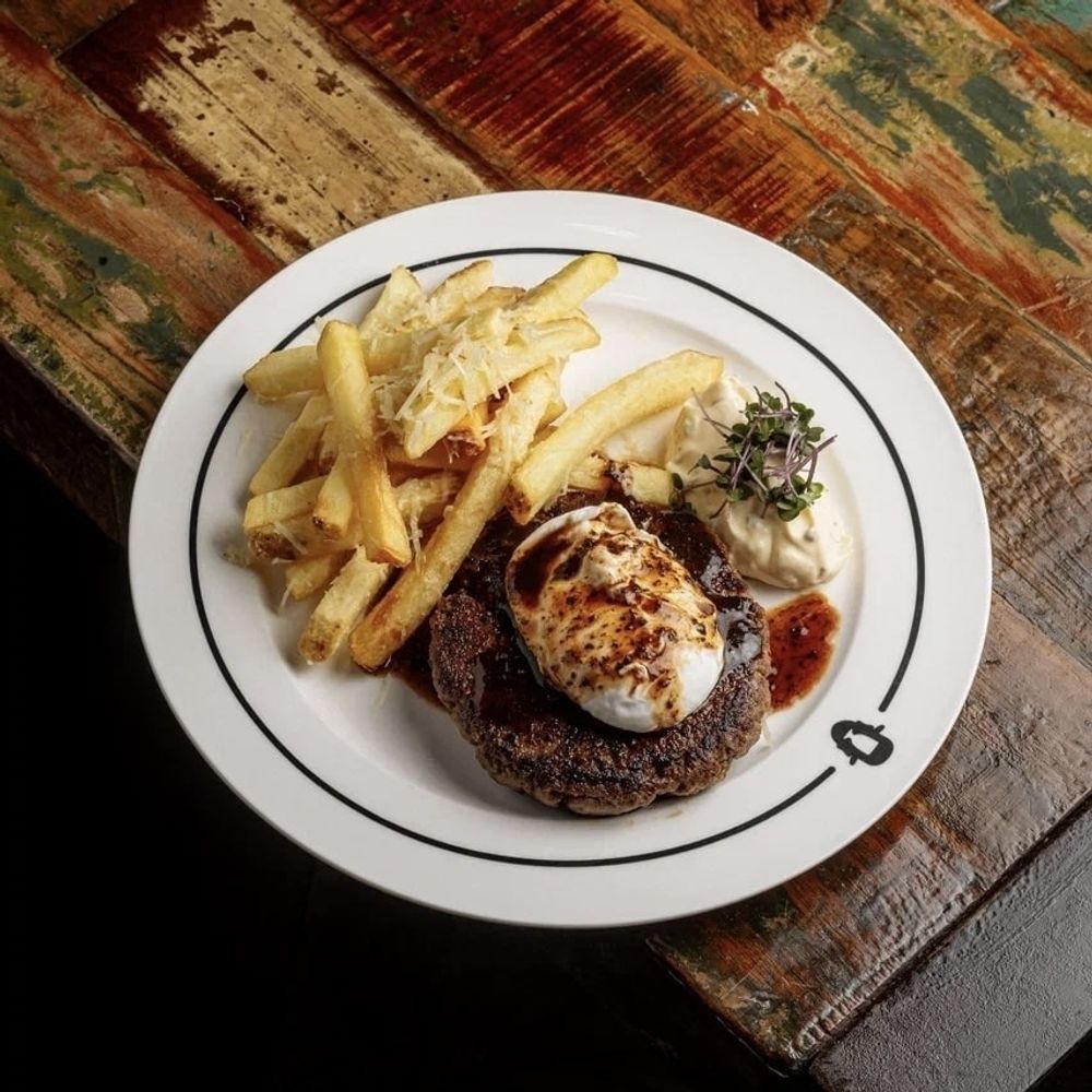 Бифштекс (говядина, чеснок сушеный, соль, перец черный, хлопья перца чили), соус ремулад (яблоки, майонез, сок лимона, горчица дижонская, лук зеленый, зелень, каперсы, анчоусы, огурцы маринованные), соус на бифштекс (демигляс, куриный бульон, паста трюфельная), яйцо пашот, картофель фри, пармезан, масло трюфельное, порошок трюфельный. Прожарка: well-done.