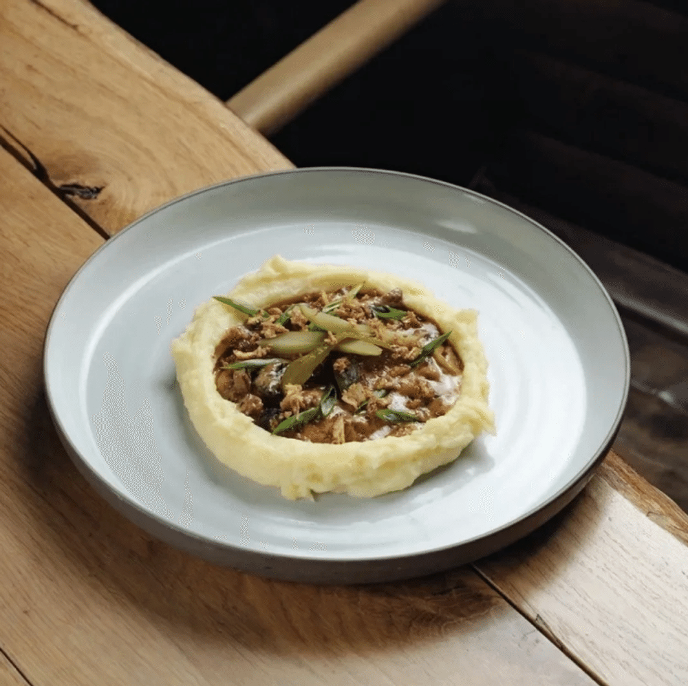 отруб пиканья (говядина), микс лесных грибов (подберезовики, подосиновики, розмарин), маринованный огурец, репчатый лук, соус наполи, сливки, соус демигляс, крем-бальзамик, экстракт солода, мёд, лук фри, масло сливочное, картофельное пюре (картофель, молоко, масло сливочное, сливки, соль)