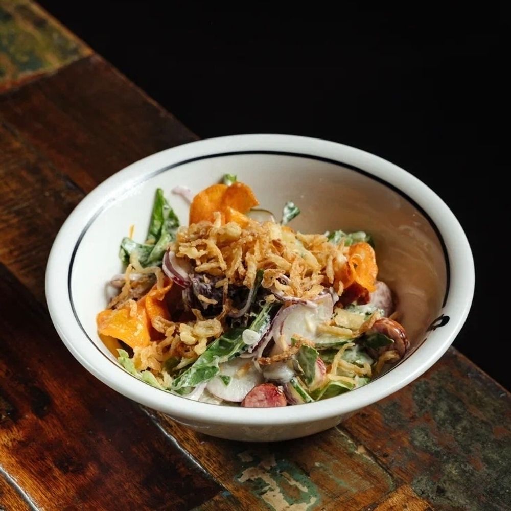 Колбаски свино-говяжьи, огурцы свежие, огурцы соленые, красный лук, микс салатов, майонезно-горчичный соус, чипсы из батата, редис, лук фри, петрушка