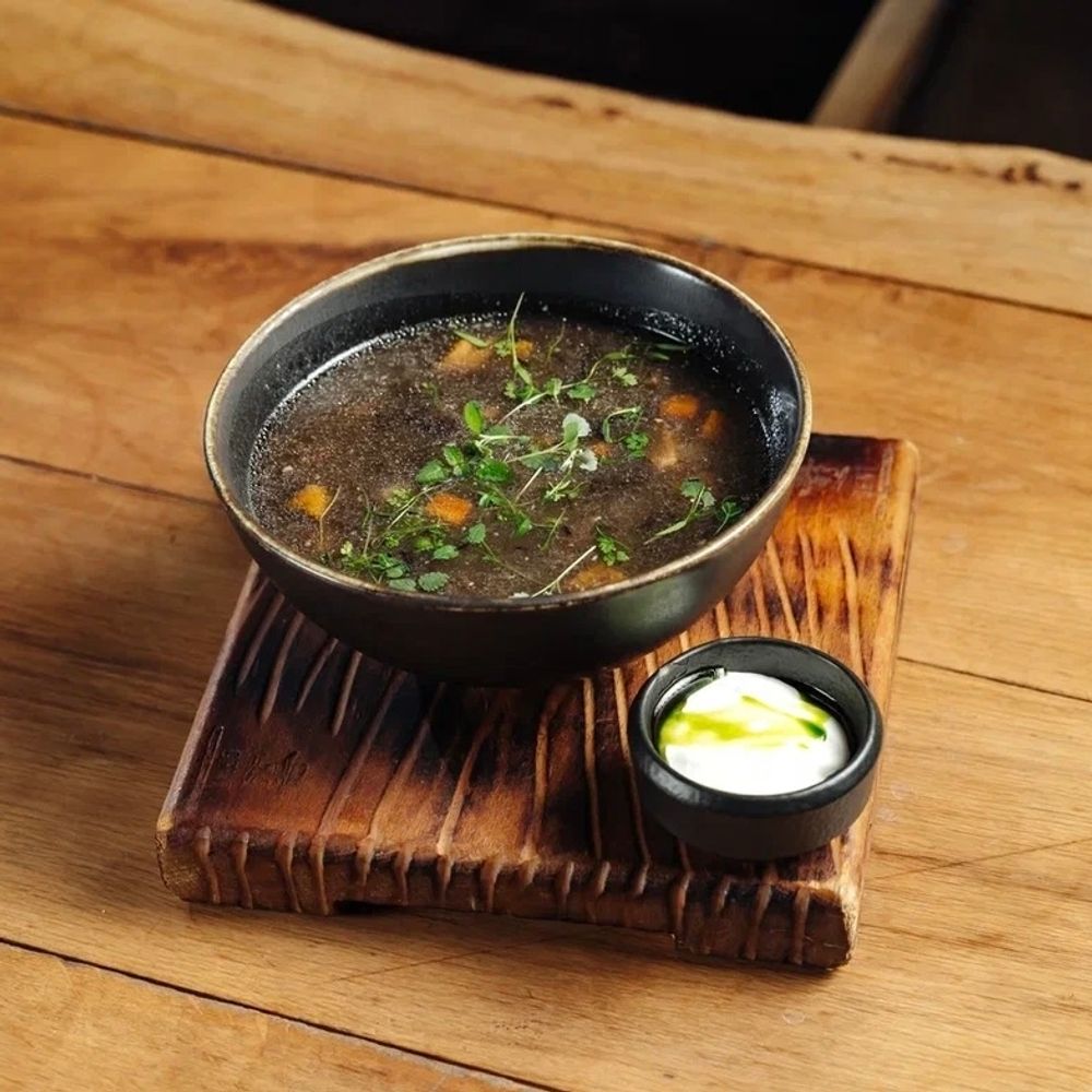грибная похлёбка (картофель, грибы микс, лук репчатый, морковь, грибы ассорти сушеные, соль), крупа перловая отварная, подосинновики, подберезовики, белые грибы, сметана трюфельная (сметана, трюфельное масло)