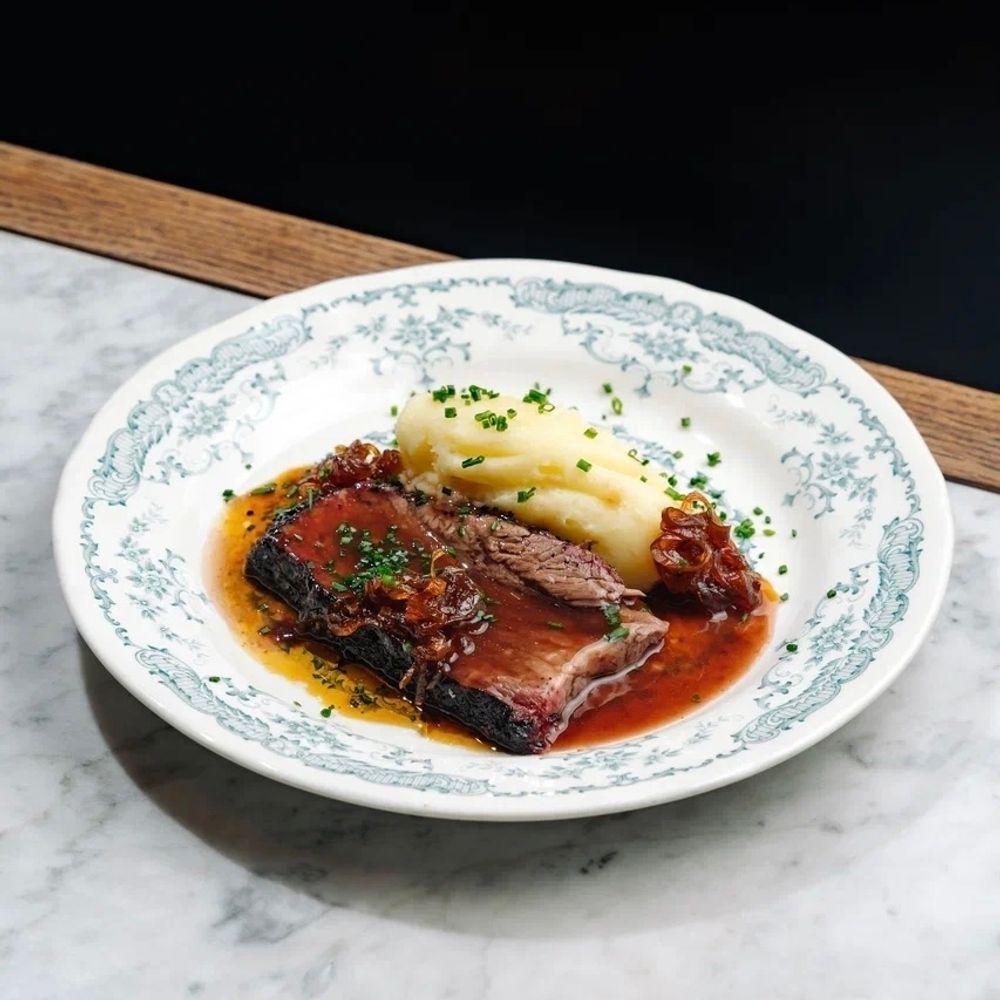 Брискет копчёный, соус винно-можжевеловый (ягоды можжевельника, специи, мёд, вино красное, бульон куриный, крем бальзамический, розмарин, ксантановая камедь), пюре картофельное (картофель, масло сливочное, сливки, соль), лук карамелизированный с тимьяном.