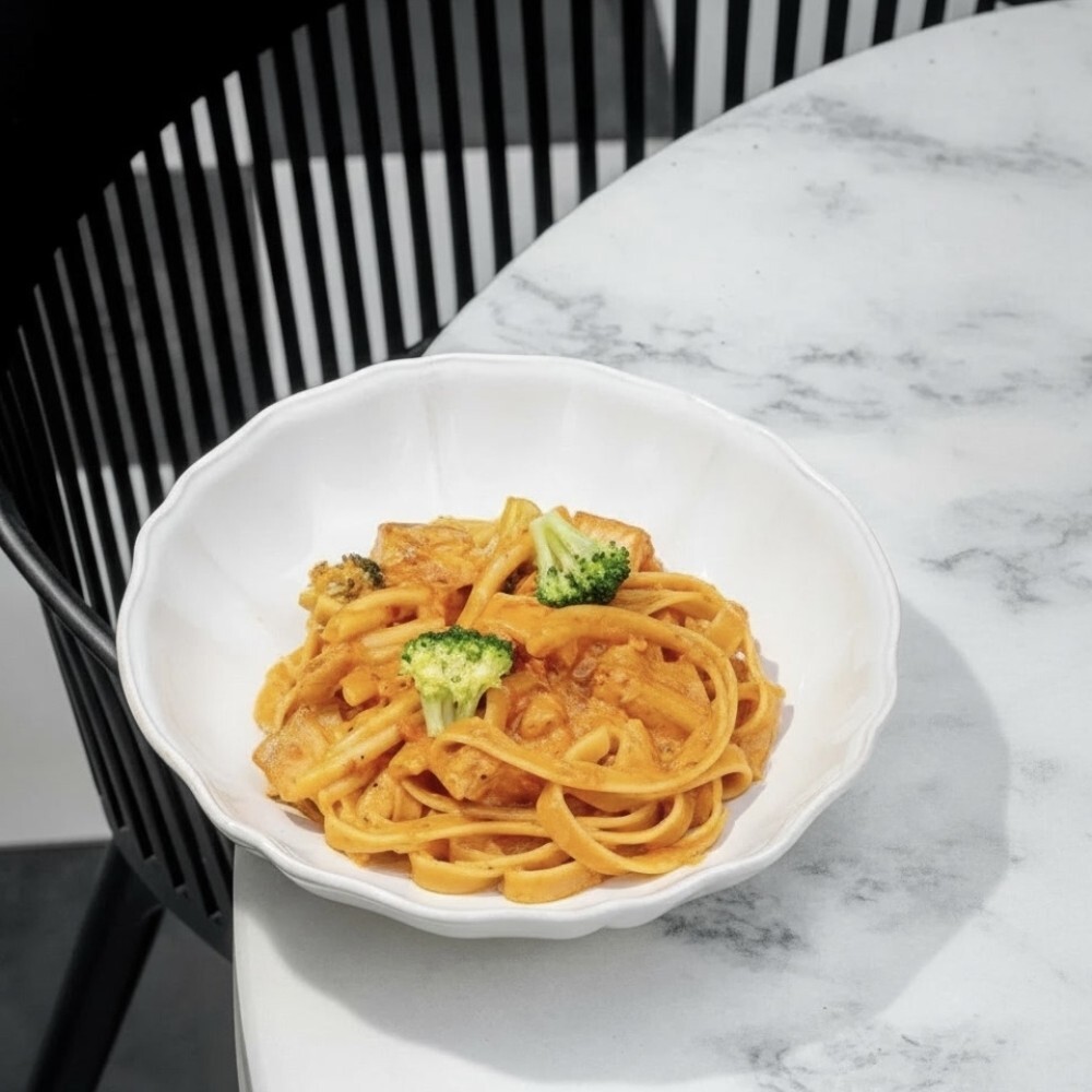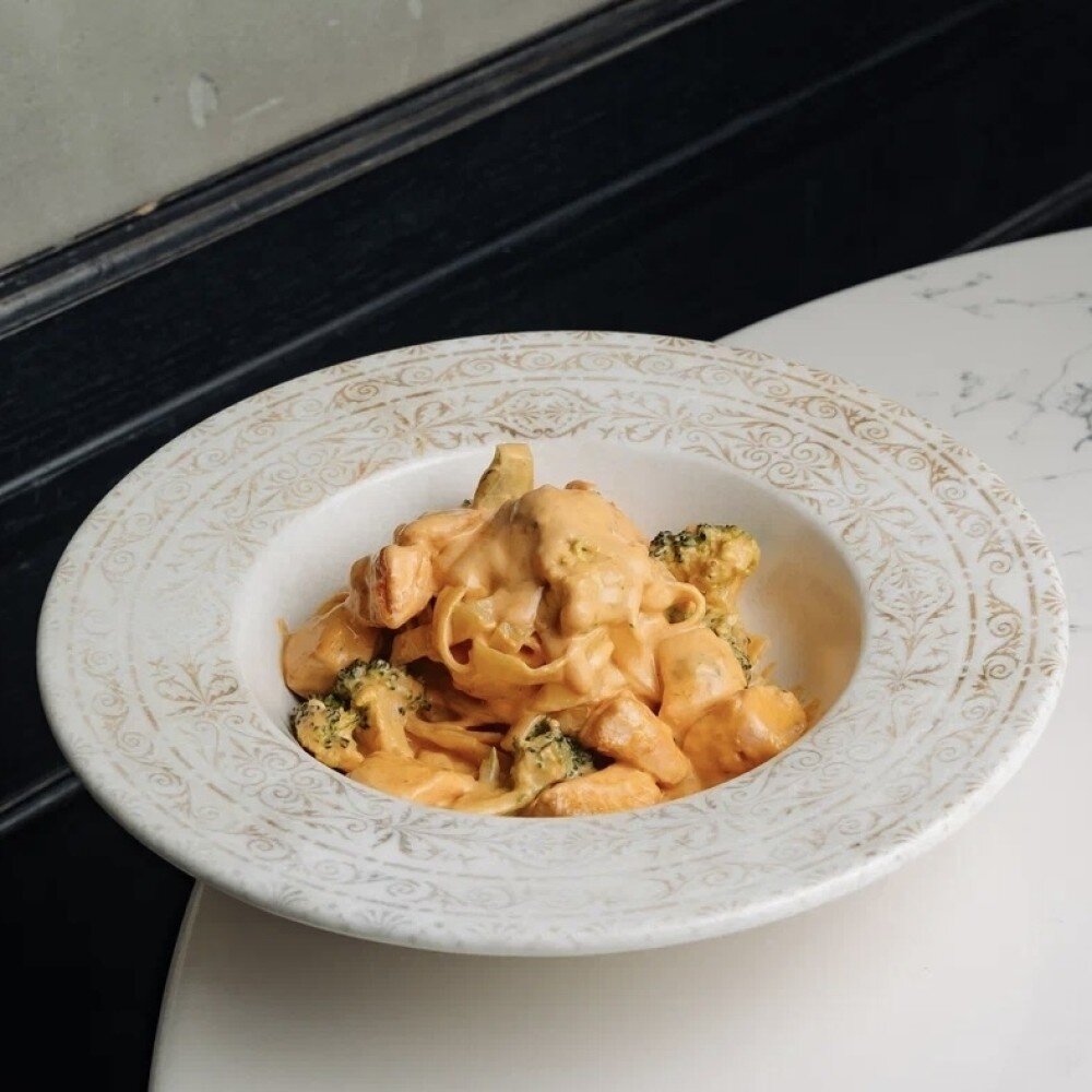 Тальятелле de cecco, сливки, томатный соус наполи, чеснок, укроп, петрушка, тайский рыбный соус, брокколи, лосось.