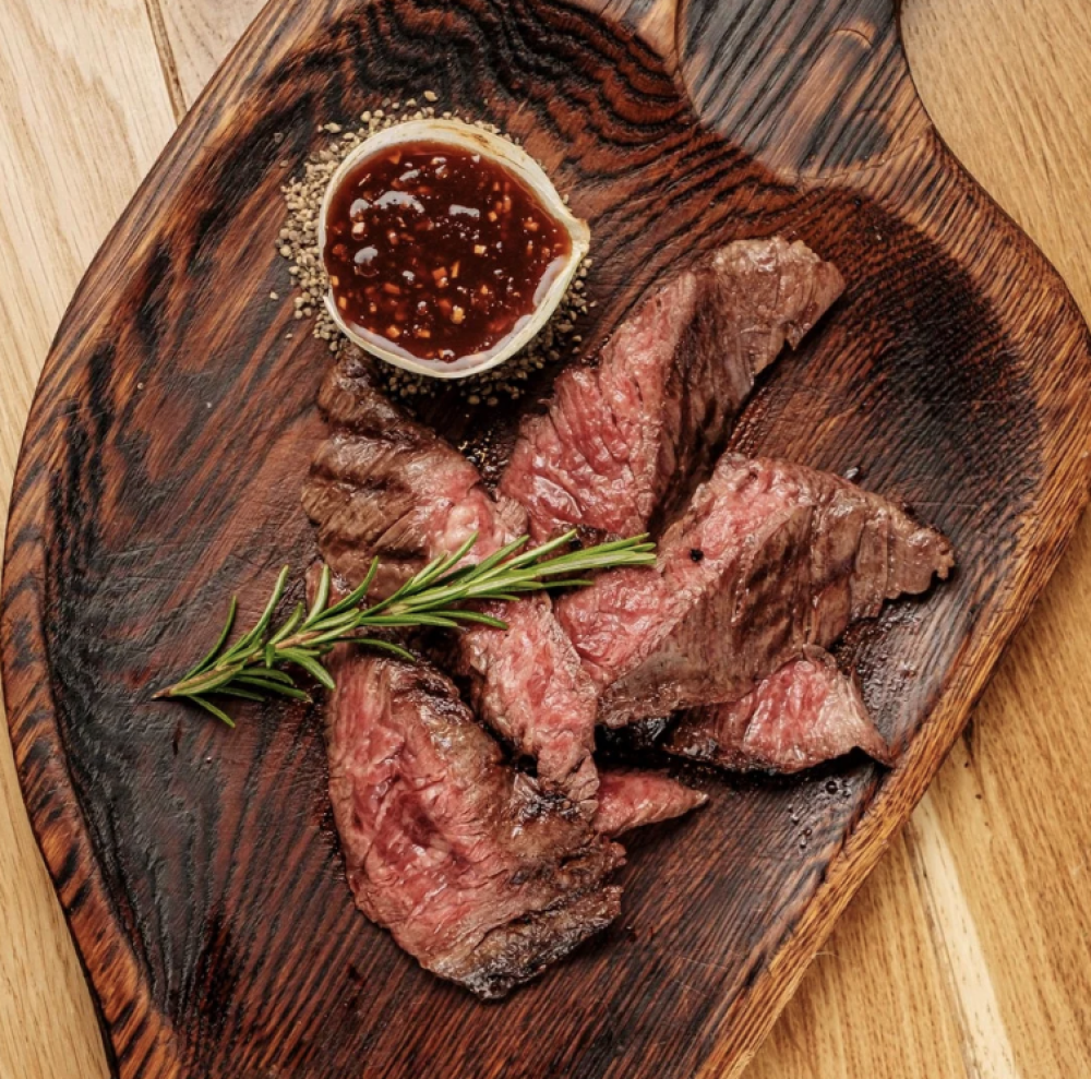 Говядина диафрагма обжаренная, соус Нью-Йорк (томаты в собственном соку, соус Устричный, соус сладкий Чили, лук шалот свежий, корень хрен свежий, крем бальзамический)