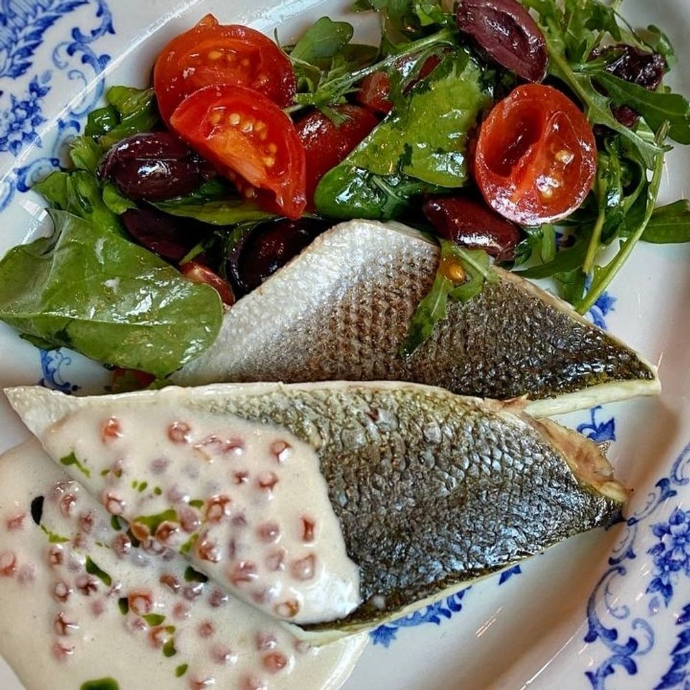 Рыба сибас филе, соус сливочный лемонграсс с красной икрой (лук репчатый, лемонграсс, сельдерей, вино белое, сливки, красная икра), соль, рукола, масло оливковое, шпинат, томаты черри.